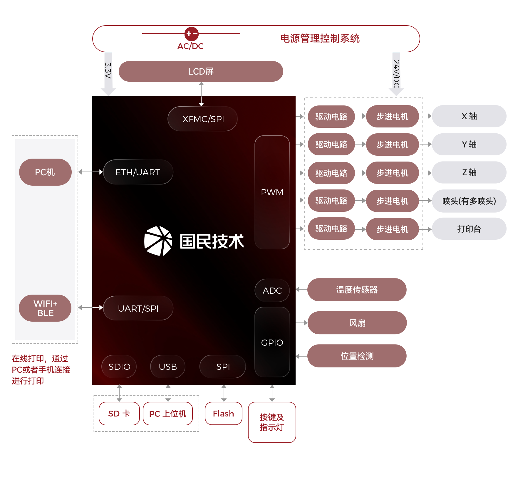 工作机会3D打印机主要分为三大部分:电机控制系统、传感反馈系统、电源系统。其中电机控制系统包括驱动喷头和控制X/Y/Z坐标位移两大部分,传感反馈系统包括位置传感器、温度传感器、湿度传感器和压力传感器。通过TF卡或者USB接口获取3D打印数据,根据传感反馈数据,实时控制喷头和位置实现出胶和精确打印。