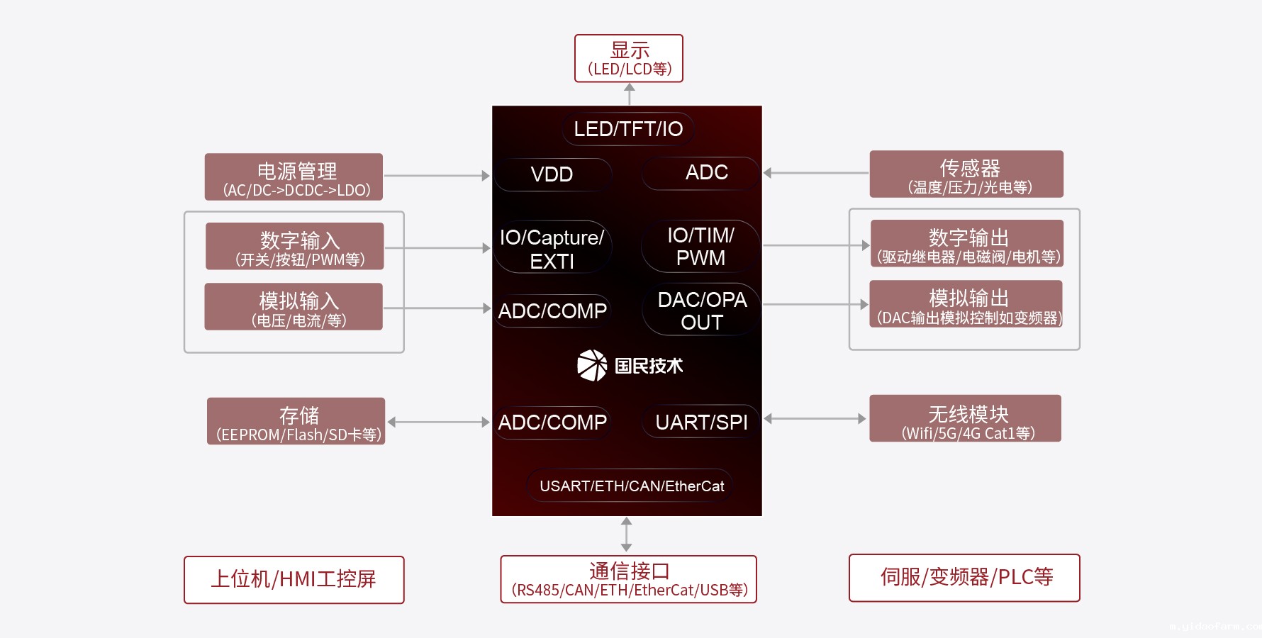 • 集成多种通信接口,包含Ethernet,EtherCAT、USB-HS、CAN-FD、USART/RS485、SPI和IIC等,其中CAN/UART/ RS485接口可任意I/O映射满足不同外设通信接口需求